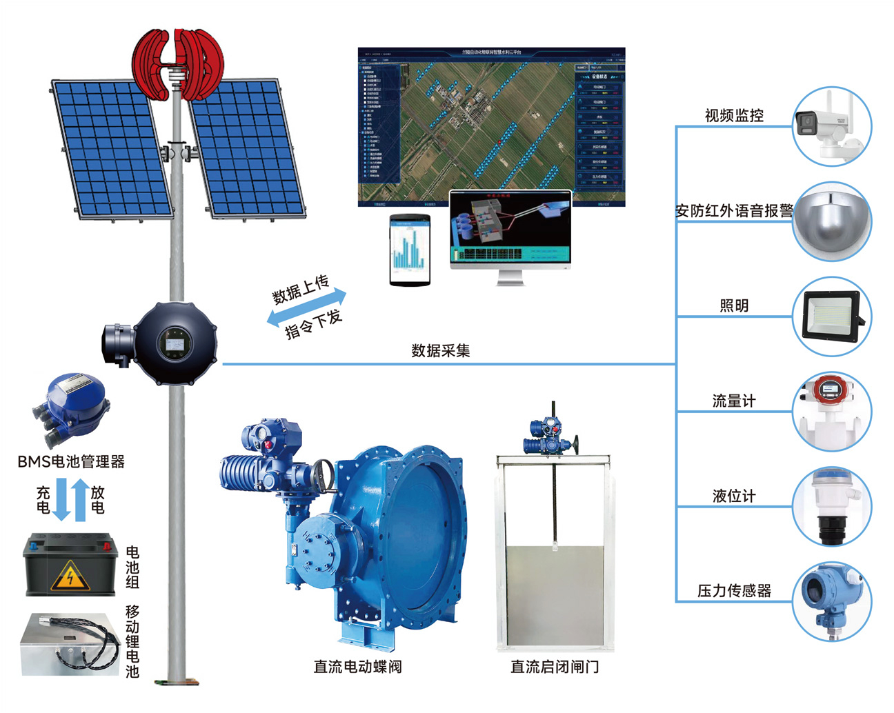 通過現(xiàn)場(chǎng)PLC控制箱、遠(yuǎn)程自診斷功能軟件和移動(dòng)版手機(jī)APP實(shí)現(xiàn)管控,采用4G、光纖等通信遠(yuǎn)傳測(cè)控信號(hào)等數(shù)據(jù)至互聯(lián)網(wǎng)遠(yuǎn)程監(jiān)控。是解決水利、灌區(qū)等引水管道、渠道上閥門、閘門控制和監(jiān)控量測(cè)等自動(dòng)化和信息化供電問題的最佳方案